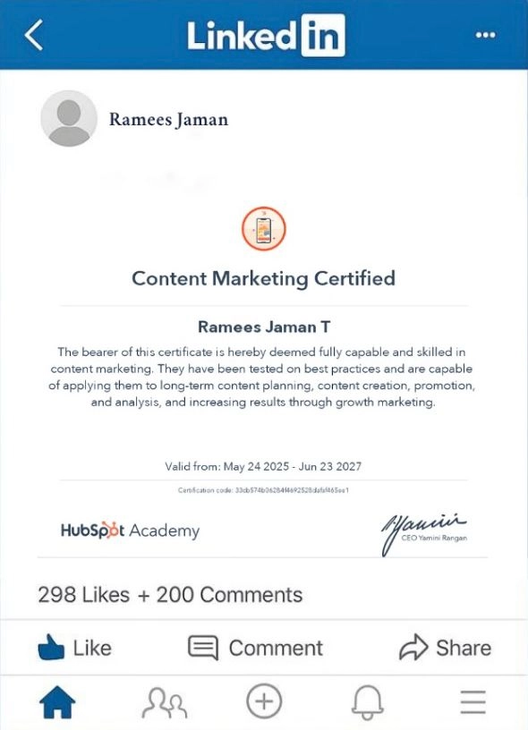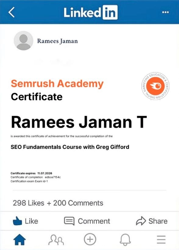 As a certified digital marketer in Wayanad, I have earned multiple industry-recognized certifications that reflect my expertise across various areas of digital marketing. These certifications validate my skills in content creation, analytics, and advertising — essential tools to help businesses grow online.