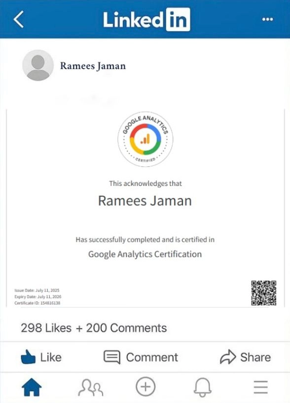 I’m Ramees Jaman, a passionate digital marketer helping local businesses, startups, and creators build strong online presence through SEO, SMM, web development, and creative content.